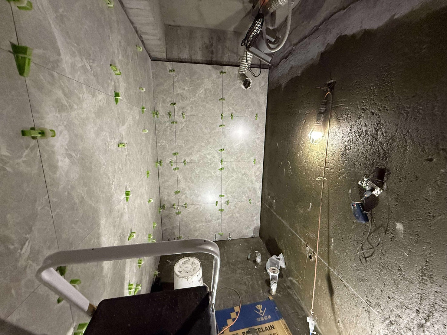 • 進行地面找平、牆面批土,確保牆壁與地板的平整度,為後續鋪設磁磚做準備。
